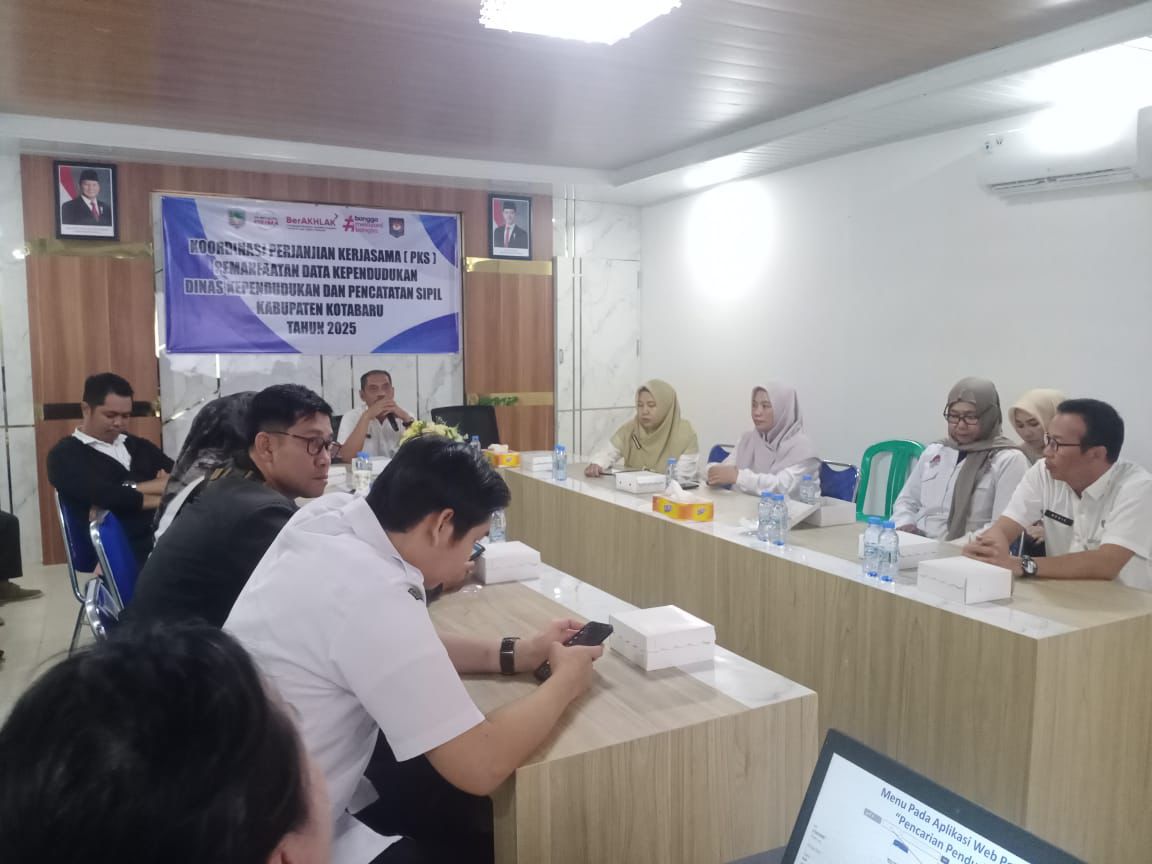 Kotabaru — Dinas Kependudukan dan Pencatatan Sipil menggelar Rapat Koordinasi Perjanjian Kerja Sama (PKS) terkait Pemanfaatan Data Kependudukan bersama Dinas Sosial, Dinas Kesehatan, dan Dinas Pendidikan, pada (sebutkan tanggal dan tempat). Kegiatan ini bertujuan memperkuat sinergi antar Organisasi Perangkat Daerah (OPD) dalam meningkatkan kualitas pelayanan publik berbasis data yang akurat dan terintegrasi.